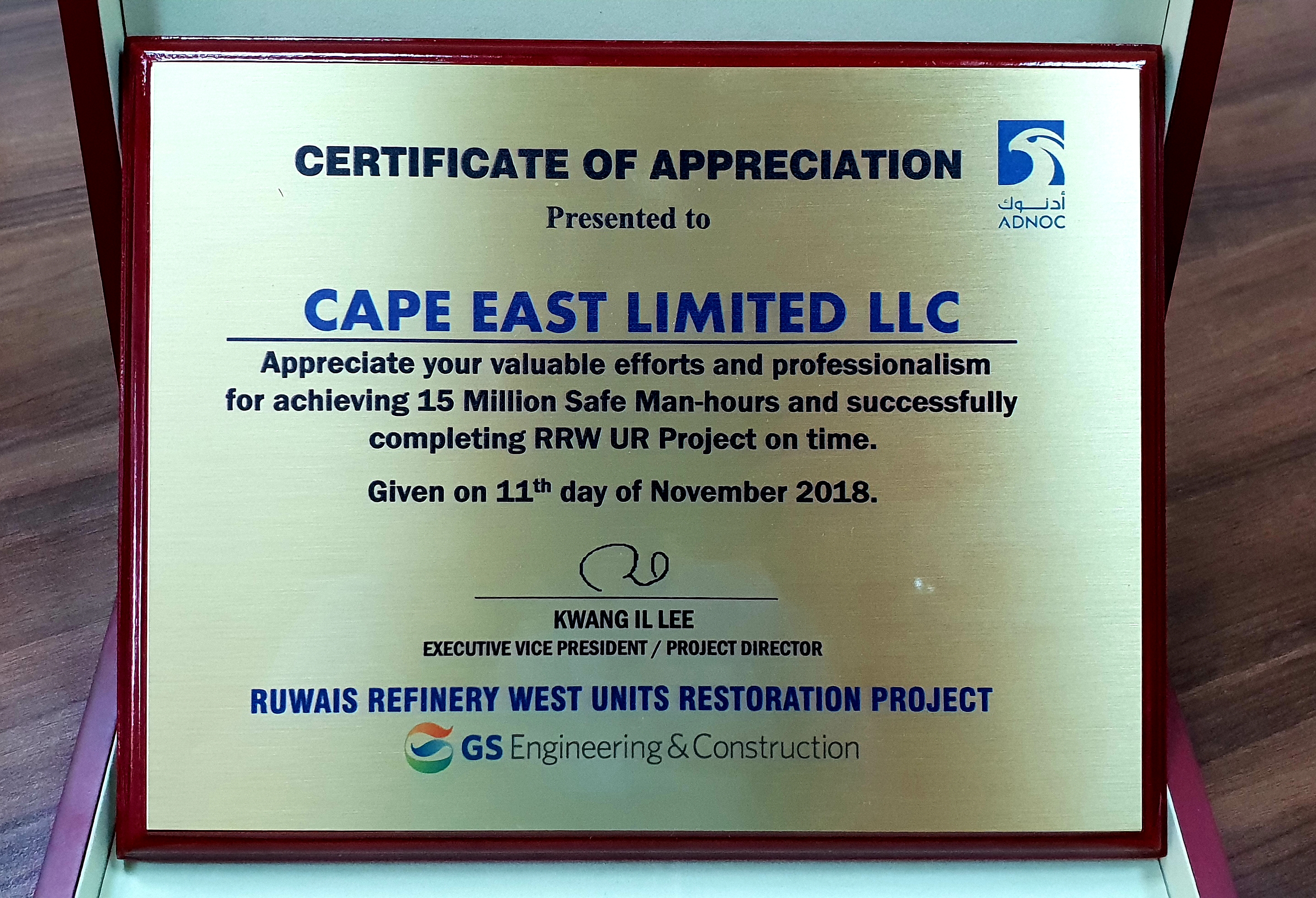 Altrad Cape UAE a reçu un certificat de reconnaissance pour ses « efforts précieux et son professionnalisme » qui lui ont permis d’atteindre 15 millions d’heures sans accident, lors de son exécution du projet ADNOC RRW UR, dans les délais impartis, en collaboration avec GS Engineering & Construction, aux Emirats Arabes Unis.