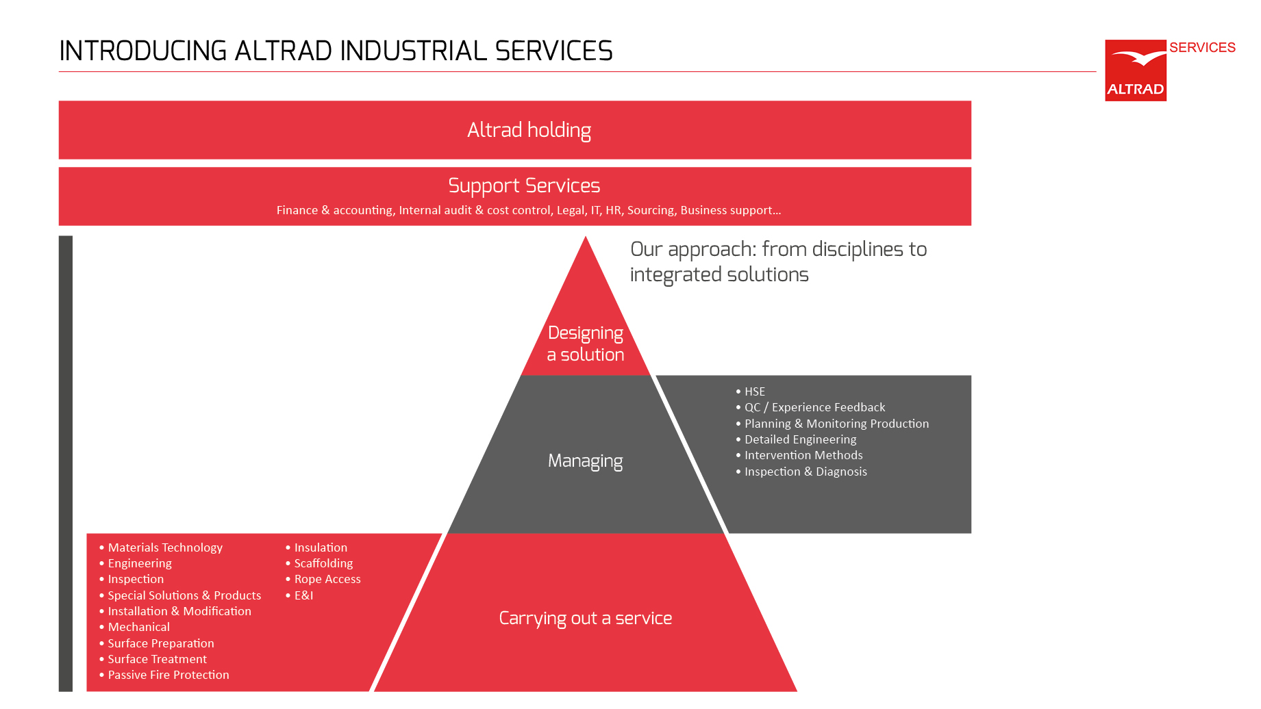 Altrad services offre des solutions industrielles innovantes à des secteurs d’activités et à des marchés exigeants. Tout au long du cycle de vie d’une installation, depuis sa phase de construction, en passant par l’extension de son cycle de vie et jusqu’à son démantèlement, nos équipes veillent à ce que les actifs de nos clients restent sûrs, fiables et performants.
