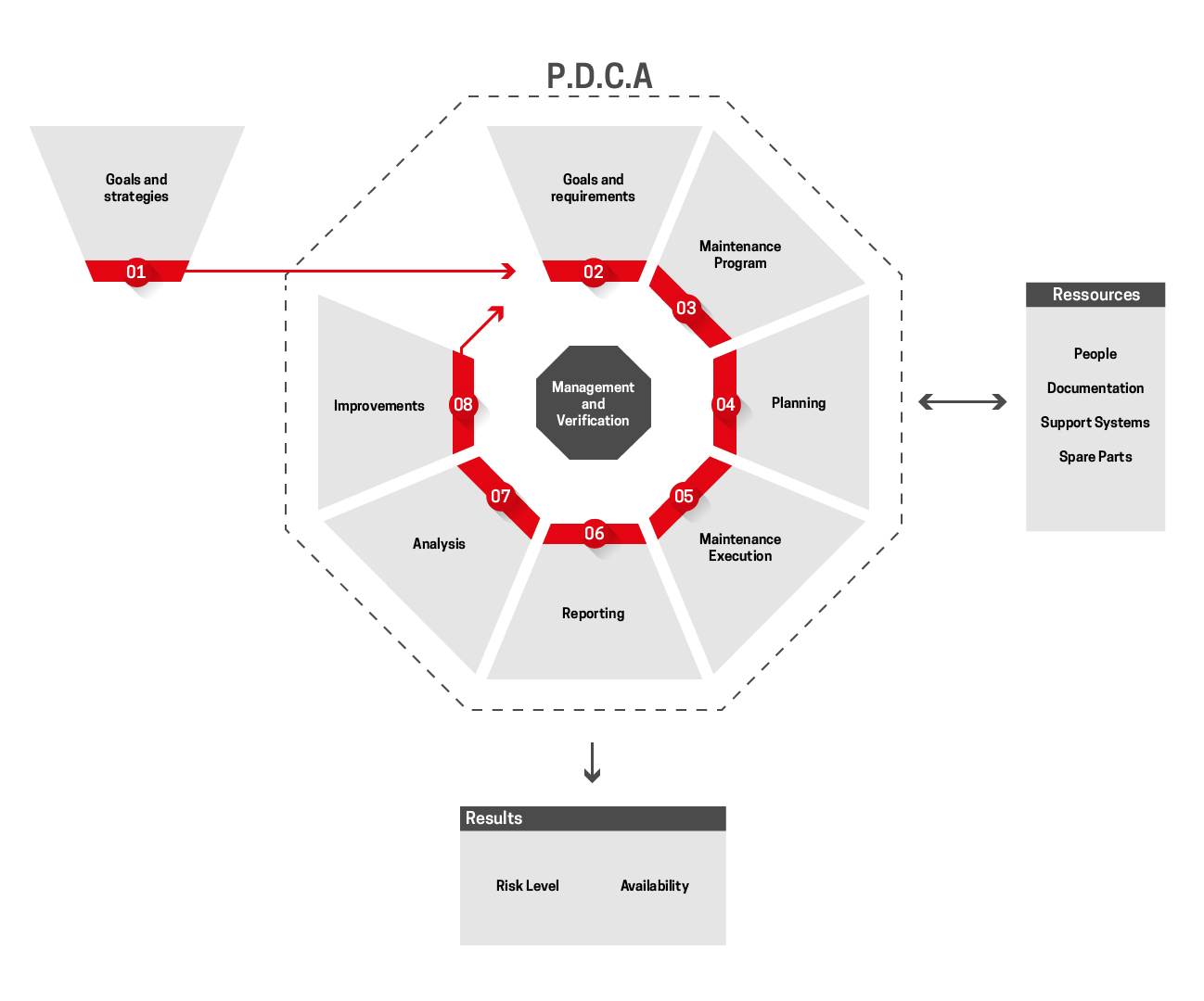 Pour gérer efficacement vos installations, vous devez disposer d’un système de gestion de maintenance qui détermine vos objectifs et vos stratégies, et qui puisse attribuer les ressources et responsabilités nécessaires à leur mise en œuvre. Votre modèle de gestion de maintenance doit déterminer le fonctionnement de votre organisation en la matière pour atteindre les objectifs de fiabilité et de disponibilité de vos installations, en fonction de vos paramètres d’attribution de ressources.
