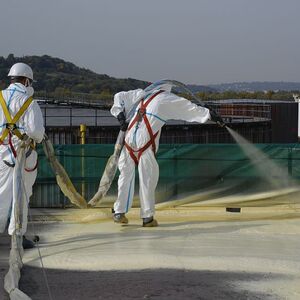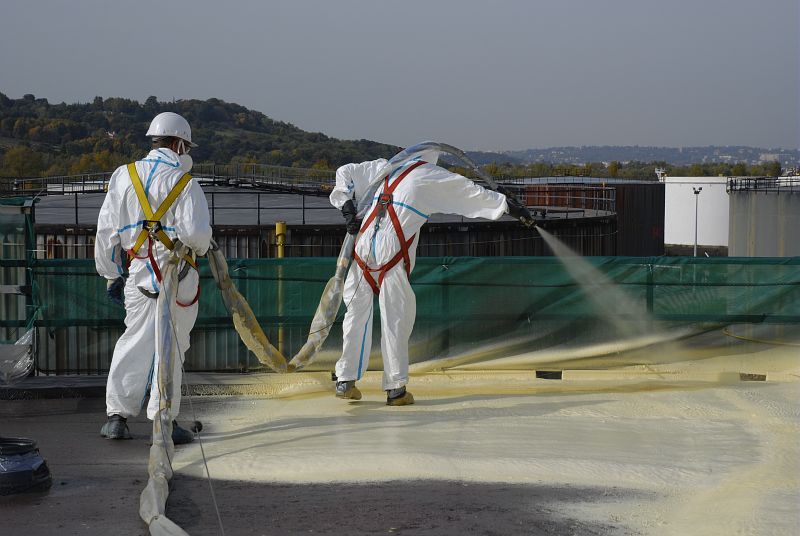 - Membranes flexibles pulvérisables à chaud (polyurée ou polyuréthane), à la fois performantes et extrêmement flexibles (résistance à la fissuration et au climat), avec une période de séchage / durcissement très courte (seulement quelques minutes)